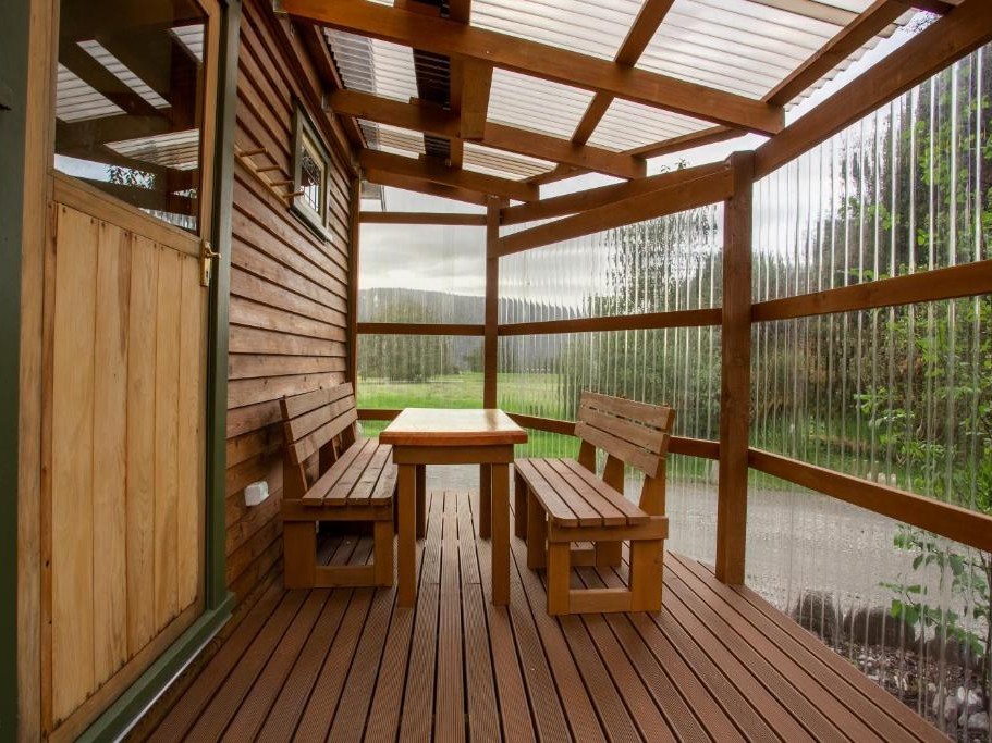 Each chalet accommodates up to four guests and includes a kitchen, bathroom, and two decks—one rainproof and heated for year-round outdoor dining. Guests can unwind in the handcrafted sauna or soak in the spa while enjoying mountain views.