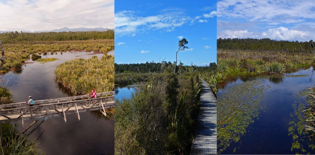 The track continues through the forest before descending around the side of a small hill to lower lying land. Elevated board walks are used to cross this swampy area, which floods regularly. After crossing this swamp the track sweeps around to the site of the Mananui Sawmill that was started in 1885. From here the walkway crosses Māhinapua Creek and its swampy margins via a foot bridge and through a privately owned deer farm, before emerging on S 6 just north of Mananui bush.